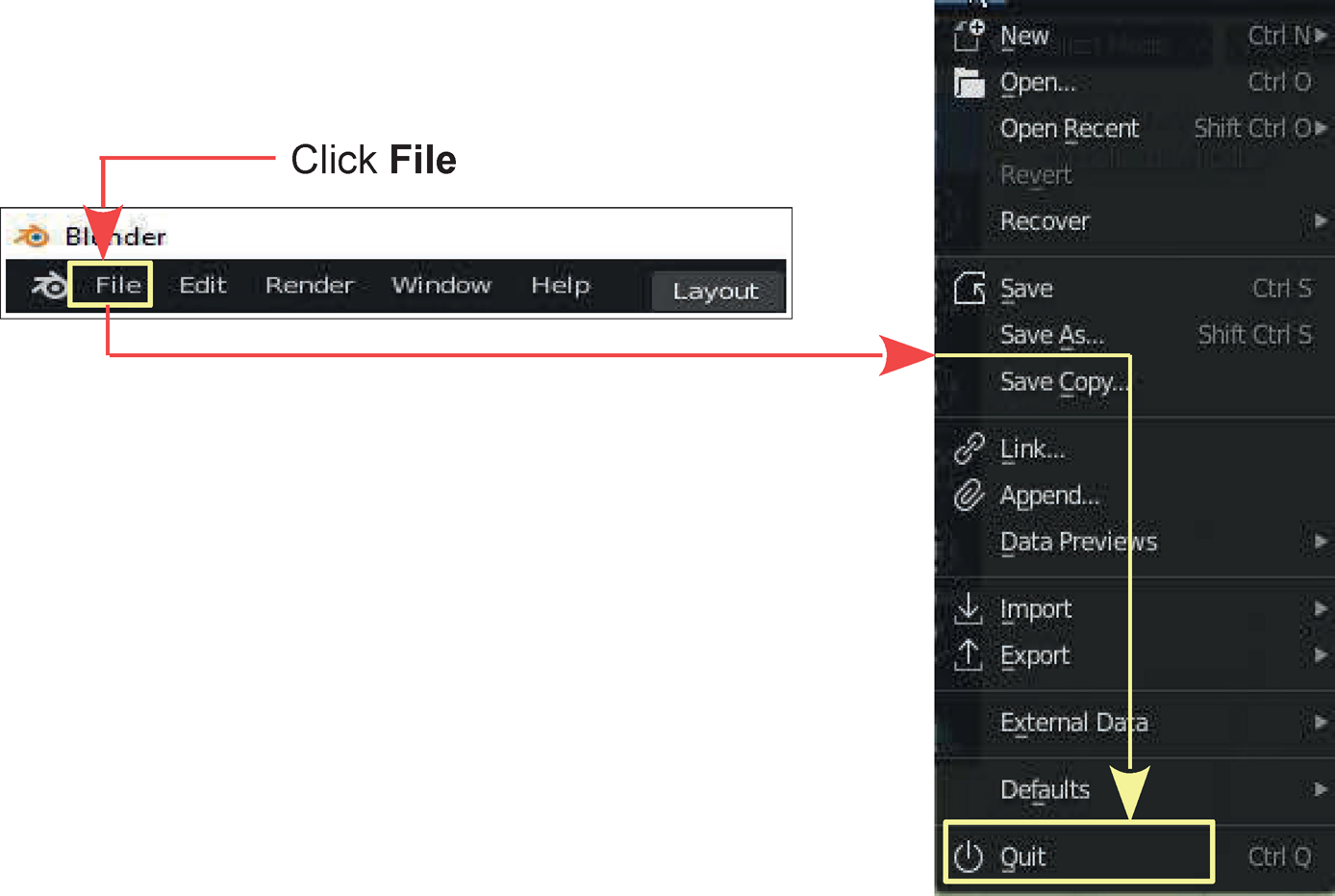 También puede cerrar Blender haciendo clic en Archivo en la esquina superior izquierda de la pantalla y seleccionando (haga clic) Salir en el menú que aparece. Reinícielo como se describió anteriormente.