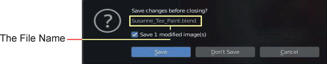 Cuando abra Blender y realice operaciones en la interfaz gráfica de usuario, creará un archivo Blender. El archivo contendrá toda la información relevante para el trabajo que haya realizado. El mensaje Guardar cambios antes de cerrar le brinda la oportunidad de guardar la información que le permitirá recuperar el archivo en el futuro.