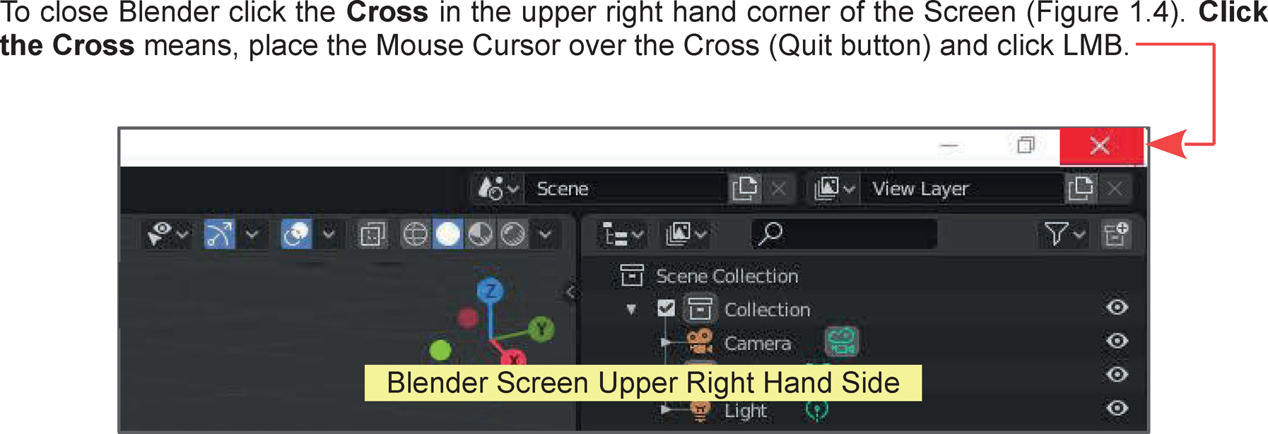 Para cerrar Blender, haga clic en la cruz que se encuentra en la esquina superior derecha de la pantalla (Figura 1.6). Hacer clic en la cruz significa colocar el cursor del mouse sobre la cruz (botón Salir) y hacer clic con el botón izquierdo del mouse.